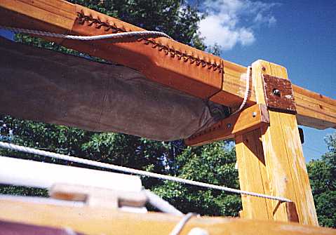 Karl said the mast here is the same one he used on Jewelbox, which means it is 3-1/2" square and solid. But you can see that in the region of the pivot bolt he has laminated another layer, probably 1-1/2" thick, onto the aft face of the mast such that the pivot bolt does not go through the main meat of the mast, very important I think since the pivot bolt area is probably the most highly stressed part of the system. Another detail worth noting is that the added doubler is well tapered on each end which avoids sudden stress concentrations which would happen if the mast cross section were to change abruptly. (Karl added the beautiful laced leather to keep the boom from chafing the mast.)