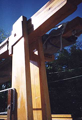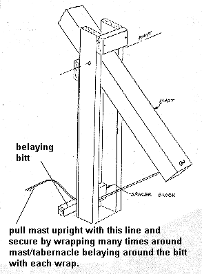 Now, if you look back at the overall boat photo you will see that the mast heel extends about three feet past the pivot, and swings down into the slot formed by the two verticals. Look closely and you will also see a rope going through the heel of the mast and going down into the bow well. Look again in the bow well photo and you can see that same rope running through a hole in a wood plate towards the bottom of the tabernacle. When the mast is walked up to vertical, that rope is held in hand and tightened when the mast is upright. To lock the mast in position, that same rope is belayed many times around and around the mast and the bitt you see running across the back of the tabernacle. That's it!