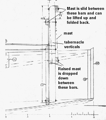 I think Karl's system is the simplest and best I've seen. The locking of the mast in the vertical position is often the trickiest part and Karl solved that with a simple rope. (Karl sails his boats very hard and I'm told this tabernacle has passed all the tests.) On some of my other tabernacle designs I used no pivot bolt, but had capture plated fore and aft at the top of the verticals like this: