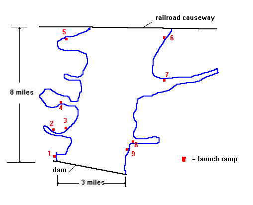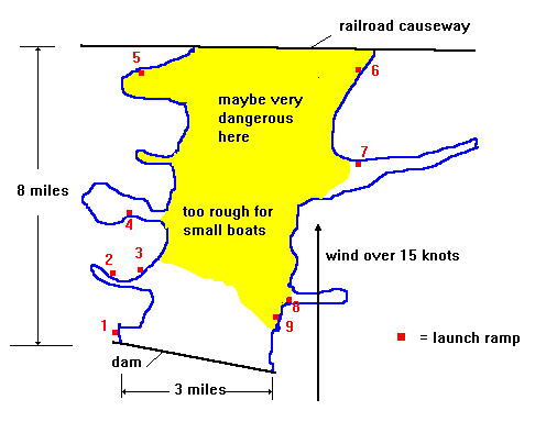 But you must be careful at ramp 1. As you look out over the water from ramp 1 you will see nothing but smooth water in the lee of the dam. The rough water is out there, out of sight. In fact even if you could see out there to the rough stuff you might not recognize it as such since you will be seeing the back faces of the whitecaps. And if you launch there and drift north to the rough water or sail there in ignorance you may not be able to sail back to the ramp!