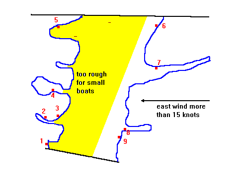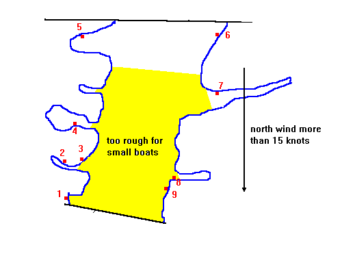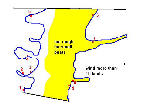 One thing worth mentioning is what you might do if you were to get into the rough stuff, finding yourself in a small sailboat without the abiltiy to sail back to the northern ramps and with no one around to help. Your best option is to sail on a close reach I think to the nearest sheltered cove. Usually the close reach allows good control, the ability to turn into the wind to luff the sail to kill its power.
