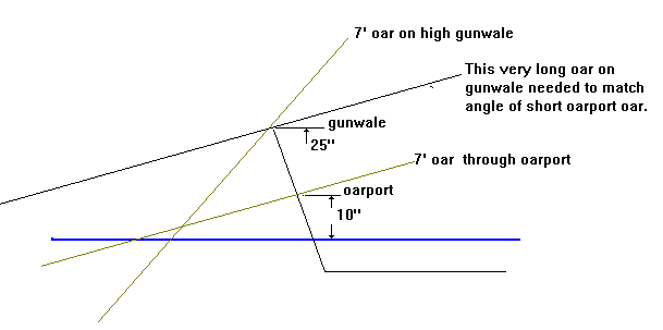 Birdwatcher rowed quite well for such a large barge at 24' with a flat bottom. The 7' oars passed through oarports that were about 10" above the water and that gave the oars very good rowing geometry. So I've been drawing oarports on most of my larger boats, although not all builders put them in. If you look at the diagram below you can see that the oar in the oarport meets the water at a much shallower angle than the one on the high freeboard gunwale. And on the recovery stroke it looks like the gunwale oar needs about two times the rotation as the oarport oar to clear the water. The high freeboard gunwale oar looks to be the case for the long oar, as you see in the diagram.