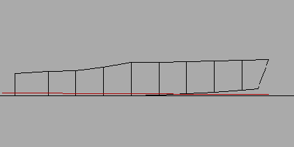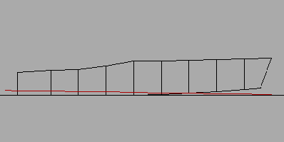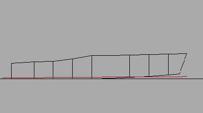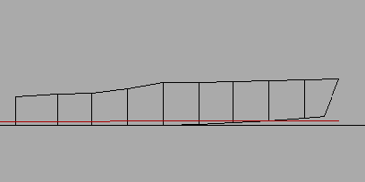 Hullforms predicts that the draft at the stern is 4.6" in this condition, with a waterline length of 12.6'. Then as Max walked forward into the cabin slot 4' the cg moves forward about 13". Hullforms shows the boat trims down about a degree, reducing the draft at the stern to 3.5" and lengthening the waterline to 14.1'. Then it looks like this: