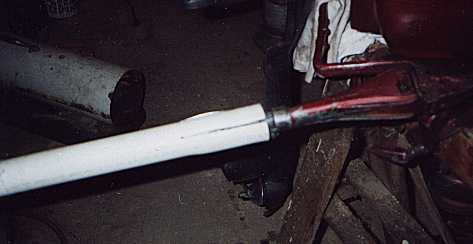 Once rubbery, the PVC will stay that way for a minute or two, long enough to push it over the end of the twist grip, and to reform it down onto the grip with your gloved hand. Let it cool there. It will return to its rigid state, but you probably will be able to spring that slotted end enough to get it on and off now at will. Here is what a new one looks like on an old Johnson. (If you think the photos were taken in a cave I will mention that we are in one of the worst winters in memory right now.) You can see the slits and a bulge where the heated pipe expanded over the end of the tiller handle: