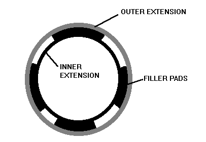 I bought a section of 3/4" ID PVC pipe and cut off a piece 4' long. It fit fairly loosely into the larger pipe. I "padded" it to fit snugly, but still loose enough to allow it to be removed quickly. First I slid the small extension into the larger as far as it would go and marked where the pads should go. To make the pads I took two 1" sections of the smaller pipe and cut them into four segments of 90 degree arcs. I fit them to the inner extension by sanding with very coarse sand paper. I glued them to the inner extension pipe as shown below: