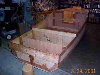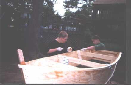 A flat iron skiff isn't built around a solid form. Instead the side planks are first cut to shape and bent around bulkheads or frames or forms which may or may not be temporary. All of these elements are defined in the plans so there should be little or no trial and error fitting. Once these basic elements have been assembled the boat's shape has been totally defined although the rest of the boat such as the bottom or decks will need proper fitting. The assembly need not be built on a rock solid base provided care is taken to see that it is straight and untwisted at every stage of construction. Usually boats like this are built over simple saw horses as you see in most of these photos, but the first photo shows the kids making a flat iron dinghy on top of a picnic table. Larger ones are often built propped a few inches off the floor. Often nothing need be leveled. Usually the best way to maintain alignment is with a string or straight edge to keep the centerlines of the forms all in a row, thus keeping the hull straight, and by eyeballing to see that the tops of the forms are all parallel, thus keeping the hull untwisted.