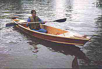 O'Hearn's boat followed very closely and he lives close enough that he brought the boat to our Messabout and I had a chance to try it myself. I thought it was quite good. I could just barely stand up in it, very common of this sort of narrow boat. It's 24" wide on the bottom and I've found that you can't reliably stand up in something that narrow. Don used the boat for fishing in little waters and keeps his butt on the seat. You paddle Piragua with a double paddle like a kayak. Here is Don's boat with his son at the paddle.