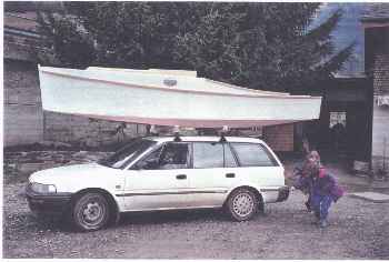 Twang is a small light power skiff, light enough to cartop if you keep your mind on weight as you build and if you can figure out a way to carry your motor and fuel in your car. It would also suit well the needs of someone who wants to carry his boat in the back of a pickup truck. She is 13' long, 4' wide, and I'm thinking about 100 pounds stripped.
