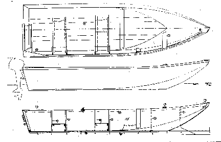 I've never seen a hull shaped like this before. Look closely at the lines and see that the bottom is dead flat lengthwise for the last 10', and also flat across for the last 7'. That gives the boat good capacity and I'm thinking the ability to plane with a small motor, say 5 hp with a light skipper. So that much is about the same as with my little JonJr. design. But the bow here is pointed and designed to meet a wave with a deep V shape and hopefully be softer riding than a jonboat or flat iron skiff. There is bound to be turbulence where the deep V meets the flat bottom but I'm hoping it won't be a factor on plane since only the aft half of the hull will be in the water then. I could be wrong and we might find out why I've never seen a hull like this. I'm quite certain it is impossible to come up with a new idea about hull shaping because everything has been tried in the past by good people. But new materials and techniques come along so that ideas that didn't work a generation ago might now be valid.