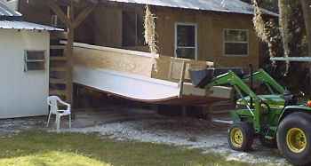 A barn in rural Florida giving birth to the first Shanteuse, this one stretched from 16' to 24'. The builder said it was easy to turn the hull but it looks like his name is John Deere.