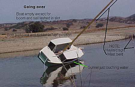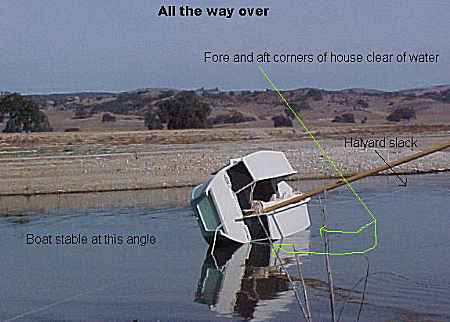 "Here's what happened. When pulling the empty boat over, the pull on the halyard to heel her was at first light, then it took more and more force to heel further, until the gunnel was immersed and the windows began to touch water. Then the load on the halyard quickly diminished, until it was gone. At this point the outer corner of the center of the cabintop was less than two inches from the water. Then the weight of the mast alone caused the boat to heel by herself that two inches, and she plopped over till the windows hit the water, then maybe one inch (of the cabintop) immersed as the buoyancy of the cabintop stopped any further heeling. The boat came to rest at that point, -(that's what I meant by stable). However the slightest push up on the mast and she popped upright. Thinking back, I bet (but didn't think to try) that a lowered leeboard would have been more than enough to keep her from "falling" that last couple inches."