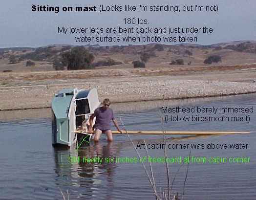 "Then when floating in that heeled mode, I waded to the hull and pressed down on the mast next to the cabintop and had to put most of my weight there to get the mast to touch, and all of my weight only put the top two feet of the masthead under an inch or so."