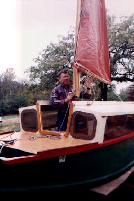 Here's Karl raising the sail. You can see how safe the operation is. It's all done from inside the boat including stepping the mast.