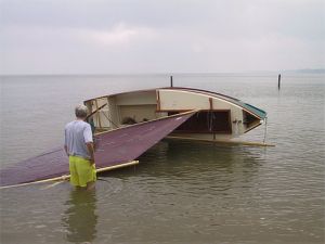 On reason I was looking forward to the test was to scope out the situation which Norm Wolf ran into with his Normsboat where the capsized boat floated nicely on its side and was easy to right but had its centerline slot pretty close to the water. Here is a photo of the situation.