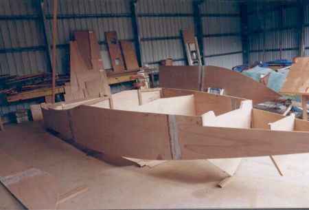 Electron is built from eight sheets of 3/8" and three sheets of 1/2" plywood using taped seams and jigless construction requiring no lofting.