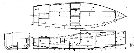 I also think this hull would be a good starting point for a sail boat. The lines are right. You would have to rethink the cockpit, trying to make it more watertight. There is a great temptation to use the batteries as ballast but I'm not so sure this boat is a good candidate for self-righting because its sides and cabin are low. And I suppose a boat with 400 pounds of lead in its belly should have six cubic feet of flotation foam so it doesn't sink if swamped or holed. There might be compromise where maybe two batteries are used, keeping the battery compartment small and yet with enough endurance for 8 or more miles in calm conditions. The weight of the two batteries might steady the boat but it might not be self righting. The drawings show a 114 square foot balanced lug sail, the same as the Bolger Windsprint, and leeboard but the sail rig is untried.