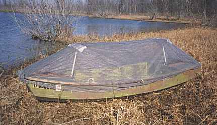 And what if it rains? My advice to beginners is never camp on a rain forecast. Since I got a NOAA radio years ago I've never been caught out in an overnight rain, but it will happen someday and I'll get wet. I've tried boat tents in the past. The first was a low tight fitting affair for m little Teal. I used it one 40 degree night and spent the evening dreaming about how cold I was. With no ventilation, the inside was damp and miserable. For Jinni I made an open ended job with six feet of heard room. It worked very well stretched from stem to stern set on a sprit boom as a ridge pole. One warm summer night my wife and I got caught in a good rain which didn't bother us at all. Next morning I rowed back to the ramp in the rain with the tent still up (no wind), oars sticking out from under the tent, and wife watching out the bow opening directing me. Now I carry the tent but don't put it up unless it really starts raining. It restricts movement, and, worst of all, my view of nature which is why I'm camping in the first place.