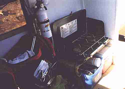 Here the canvas has been removed and the top of the stove opened. The stove is a standard two burner "Century" propane camp stove. The propane bottle is only connected when I'm cooking. I keep the propane bottle in the cockpit, out of the cabin, when I'm sleeping. The stove is on a light plywood shelf. Under the shelf is a cooler and a plastic bin that slides out and contains all the cooking stuff and usually has enough room for a few stew cans, a coffee jar, etc. It has all worked out very well and after decades of using a backpackers stove, having two burners is a real luxery.