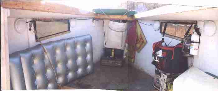 The things worked so well that I went back to the store and bought two more lights (with another stop at the hardware store for more good bulbs) and wired up the other side. Now when I turn them all on the cabin is lit brighter than almost any room in a house. Very glad I got these lights on board. Here is a photo of the interior of the boat and you can see the light domes by the windows and the battery way up front. (The photo is a composite of two wide angle photos and the boat really isn't as wide as it appears here.)