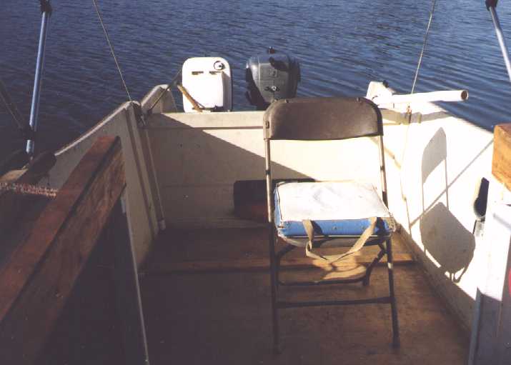 Nothing there besides a chair - a "found" folding chair with an old boat cushion on top. The old Sears 5 and Wards 12 are seen abaft. The motors have a 4' long tiller extension that allows me to steer the boat from the position shown. You can see that extension on the port side of the chair. The chair can be folded up and then I have a dancefloor.