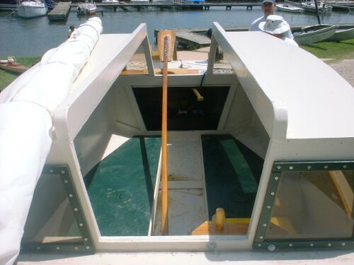 These boats can be self righting without ballast because the crew weight works as ballast. They sit down low on the floor looking out through the windows (although I found standing in normal winds was quite acceptable). In addition, the high cabin sides provide lots of buoyancy up high to ensure a good range of stability. IMB, which is small and has no ballast, will probably self right from 60 or 70 degrees of heel, but the larger ones such as the water ballasted Scram will self right from a full 90 degrees knockdown. Others like the original Birdwatcher and my Jewelbox have 1" thick bottoms which give enough weight down low that they self right from a "windows in the water" knockdown. Here is a photo of the inside of Bob's IMB: