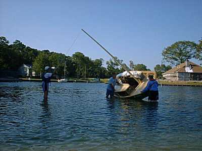 Here is what we did. TheIMB was beached and we removed the trolling motor and battery and all the loose things. The boat was walked into waist deep water, parallel to the shore, and human anchors placed at bow and stern. The halyard was secured to the mast and its free end given to me close to the shore. So I could pull the boat over with the halyard while the good folks held the boat in place.