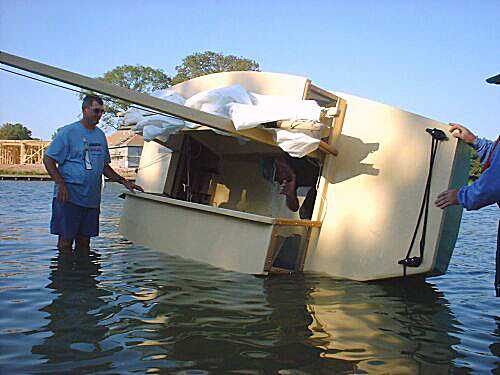 But we were finding it was not all that foolproof. Scram Pram, which is a 16' x 6' version of IMB, was tested to capsize twice (once accidentally, once on purpose) and found to lie stable on its side when knocked down to 90 degrees. That was not much of a worry since Scram is supposed to have 300 pounds of water ballast and when that ballast was tried on the prototype, the boat quickly self rigthed from 90 degrees. There was a feeling that much less ballast was needed. But the fact was that with one large crewmember inside acting as ballast, the Scram would not self right without the water ballast.