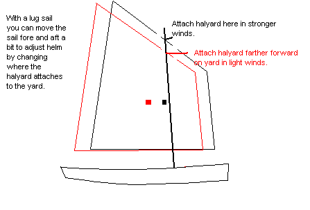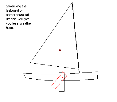 If your boat has too much weather helm you would think that the sail forces are too far aft of the hull forces. If you have a pivoting leeboard or centerboard, you can sweep the board aft on its pivot. That should move the board area aft and bring it into alignment with the sail force. There is a powerful arguement that boats should be designed this way from the start - with the sail area too far aft with the idea that the pivoting board will be swung up to adjust. Trouble is that we have in our minds an idea of what a boat is supposed to look like - the sails way up front. On a leeboard boat that is hard to get along with since the leeboard will have to go up front too and with it the widest beam of the hull. It would work pretty well with a scow hull but with a pointy bow we all seem to want our sails up front and our big beam behind!
