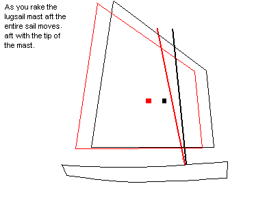 For a lugsail the effect is even more pronounced because the sail is tied right to the top of the mast. So, let's say with IMB that we have a 16' mast with 2' between step and partner, then moving the step forward .5" moves the tip of the mast aft 3.5". With it would go the entire sail area since the entire sail hangs from the masthead.