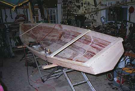 Philsboat uses taped seam construction. Five sheets of 1/4" plywood, five sheets of 3/8" and three sheets of 1/2" plywood.