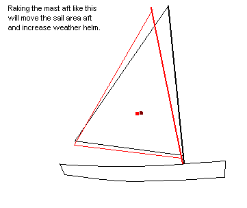 This rig trim game is usually one of inches. I think about the most effective way to trim out a rig is by adjusting the rake of the mast. If you look in Howard Chapelle's great books about boating 50 or 60 years ago, you will see that the old timers sometimes used adjustable mast steps. They could move them fore and aft just a few inches. But a few inches of motion on the step moves the sail above by a lot, usually maybe four times the step adjustment. For example, if I were to move the mast step on Birdwatcher forward two inches, the mast is raked aft and with it goes the sail. The tip of the mast would move aft about ten inches. The triangular sail of Birdwatcher is tied right to the mast. Its center of area would move aft about 4".