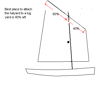 ...you have another option of moving the hoist point fore and aft on the yard. Having used these for almost 20 years now I can tell you that they function best with the yard crossing the mast at about 40% like this: