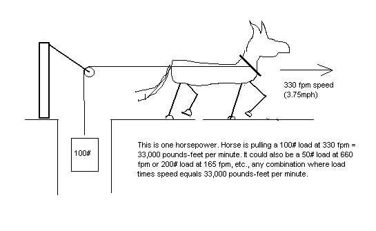 All goes very well until the Duke's miners pick up the pace and start working Edward harder than he can on a day to day basis. Edward calls everyone together for a meeting and tells them," Look, I'm a totally average work horse. When I walk at 3.75 mph (which is 330 feet per minute) I can tell that the most weight I can pull is 100 pounds. Let's multiply that speed by the load I pull. So 330 fpm times 100 pounds is 33,000 pounds times feet per minute. Somebody write that down and call it 'one horsepower'!"