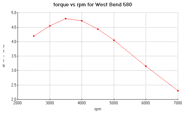 Of course since horsepower is just torque times rpm times a constant you can quickly figure the horsepower and plot it. For example from the chart above we might read at 5000 rpm that the torque is 4.05 ft-lbs. So the hp at 5000 rpm is 4.05 x 5000 / 5254 = 3.9. The hp chart below is from a real old magazine where a West Bend 580 gokart motor was tested. Motors like this were also used in smaller outboards like the Elgins. Here is the horsepower chart for that motor: