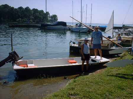 Jonsboat is just a jonboat. But where I live that says a lot because most of the boats around here are jonboats and for a good reason. These things will float on dew if the motor is up. This one shows 640 pounds displacement with only 3" of draft. That should float the hull and a small motor and two men. The shape of the hull encourages fast speeds in smooth water and I'd say this one will plane with 10 hp at that weight, although "planing" is often in the eye of the beholder. But a 15 or 20 horse motor is often just a little heavier and just a little more expensive and the extra power can be useful if you start to carry extra passengers (recalling that to plane a boat you usually need 1 hp for each 50 pounds of weight.) The prototype was built by Greg Rinaca of Coldspring, Texas and his boat is shown above at a Lake Conroe messabout. But here is another one finished about the same time by Chuck Leinweber of Harper, Texas: