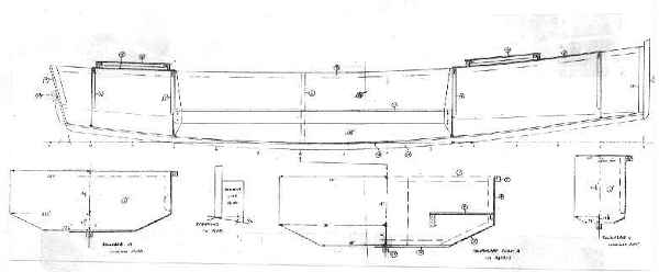 Ladybug's hull has the layout I like the best - a 6-1/2' cockpit between two storage/buoyancy boxes. It would be a great solo camping boat. The buoyant wooden spars prevent it from turning turtle. You bring it upright with weight on the lowered leeboard. Then you must climb back on board and a slot in the rudder seems to be the best boarding ladder around, bringing your weight back on board where it least affects the boat. You will have to bail some water.