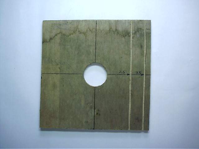 Start with a 10" square of plywood. Draw crosshairs on it. In this case I cut a 1.5" diameter hole in the center to allow it to be used with props already mounted on the motors but the hole is better omitted otherwise. Then I cut narrow grooves out 2.5" and 3.5" from the center.