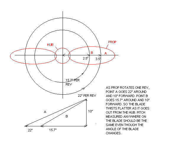 Let's say this one has a 10" diameter and a 10" pitch (actually a common size for a 20hp or so outboard). Look at point A which is 3.5" from the center. As the prop turns a revolution that point will travel pi times 3.5 times 2 = 22". That point will also travel forward 10" (by definition as a 10" pitch) with that revolution assuming no slip so the angle the props face moves through is 10 to 22 which is 24 degrees. Now look at point B which is 2.5" out from the center. That point will turn 15.7" with each rev (pi x 2 x 4.5 =15.7) but travels forward the same 10" as point A. So the prop face there moves through an angle of 10 to 15.7 which is 32 degrees. And so forth along the entire face so that you see as you move from the hub to the tip the blade twists to have a flatter angle. I would think that any effort to "repitch" a proper propellor would be a compromise because you won't be twisting the area near the hub as much as that near the tip.