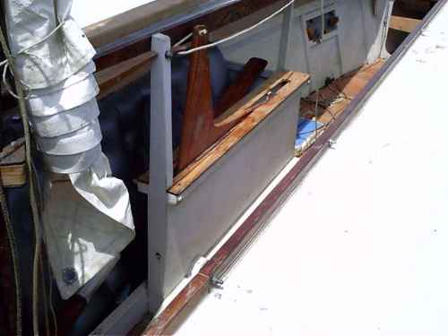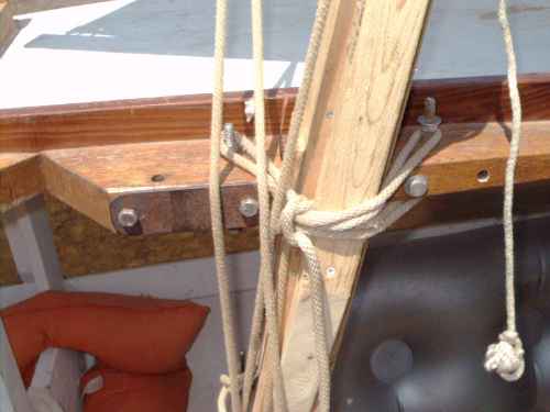 I decided to splint the old mast to stiffen it and get some good material over those interesting knots. I got a good 2x4 and stripped off two good lengths about 1-1/2" square. They are 10' long and the mast is about 16' long so the splints don't go from heel to tip. I suppose they start 2' up and are about 4' short of the top, but they cover the main meat of the mast and bridge over the knots. You can see them in the photo of the partner. One is on the forward face of the mast and the other on the inner face. So I had to enlarge the new notch in the partner fitting. The rope latching system took the added splint in stride, something the weldment would not have done. Ugly but effective.