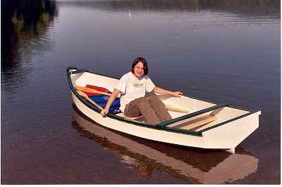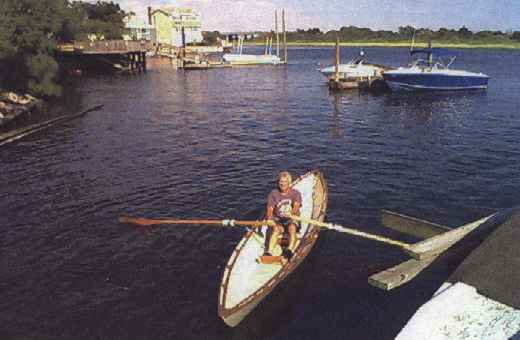 The prototype Batto was built by Ray Schaefer of Brooklyn, NY. He is a very experienced builder and oarsman. He writes, "Here is Batto in action, Harry Rasmussen test pilot. Slick as snot. Fastest fixed seat I ever rowed. It's a pleasure to row into a good wind and make good progress."