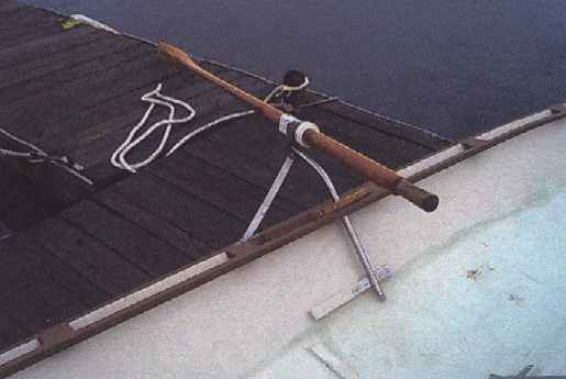 Actually this is not a new partner but the original with another notch cut into it aft of the sharpie mast notch. If you look forward (left in the photo) of the mast you will see a "V" where the original mast mounted and can still be mounted. Luckily the original mast partner fitting was quite long. The original mast has a weldment that clamps around the mast and secures it. A long time ago Marc Smith made a BW without the clamp, instead using a simple roping system to secure the mast. I've copied that method on the lug mast. There are half inch bolts either side of the mast and a 1/4" line that belays around the bolts and mast many times. Works fine. Low tech. No more weldments to bump into. The "bury" of the BW mast mounts is over 3' so the rope system works very well but if you have a low sided boat with a very short bury it may not work so well.