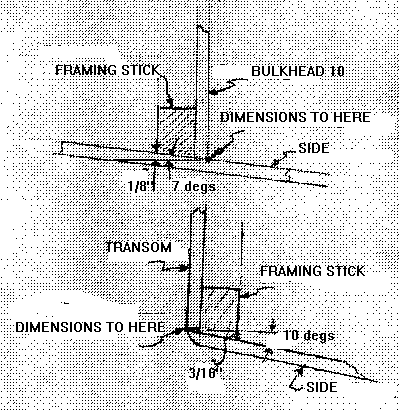 So I've gone to making the inny bulkhead the same way as I make an outy. First I prebevel the framing sticks with a table saw. Then I cut the plywood panel to shape with no bevel, just a square cut. Then I glue and nail the sticks to the sides of the panel. If the bevel is severe I do try to line up the face of the bevel stick with the "Dimensions to Here" edge of the plywood. Then I will have a small triangle of plywood protruding from the beveled face. I can trim that off later. In the case of a small bevel, I don't do that. I just line up the stick with the back edge of the panel. When I assemble it to the sides there will be a little triangle to fill with glue again. And the panel will be slightly wider than what the lines call for. In the case of Toto's bulkhead 10 the error would be .25" X tan7 = .03". Nothing to worry about.