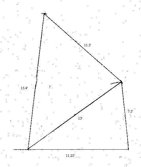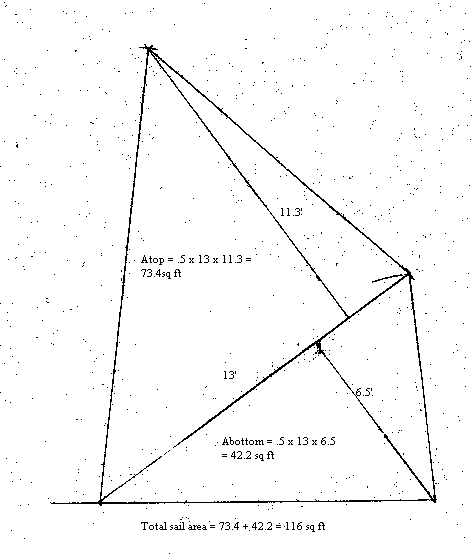Of course if your new sail is triangular you need only one triangle. But here we have two to define this four sided sail. Each triangle has its area calculated and the total area of the lug sail is the sum of the two triangles. To calculate the area of a triangle you need a "base" and a "height" which is perpendicular to the base. You multiply the base times the height and divide the result by 2 to get the area of a triangle. In the top triangle here the base is 13' and the height is 11.3' so the area of that triangle is 13 x 11.3 / 2 = 73.4 square feet. The bottom triangle figures to be 42.2 square feet so the total is 73.4 + 42.2 = 115.6 square feet. Note that all the dimensions are measured off the scale drawing.