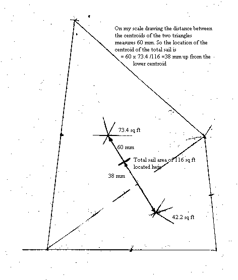 Next you use that info to figure the centroid of the total sail. It lies on the line that spans the centroids of the two triangles. So first you draw that line. Then measure the length of that line. The total sail centroid is located by using the ratio of a triangle's area to the total area, times the length of the line. In the example the ratio is 73.4/115.6 measured away from the centroid of the smaller triangle. On my scale drawing the length of the line between triangle centroids measured at 60mm so the total sail centroid is 60 x 73.4/115.6 = 38 mm measured from the centroid of the smaller triangle. You could also figure it using the smaller triangle, giving a ratio of 42.2/115.6. That times the 60mm length gives 22mm measure down from the centroid of the larger triangle. It is easier seen that written, like this: