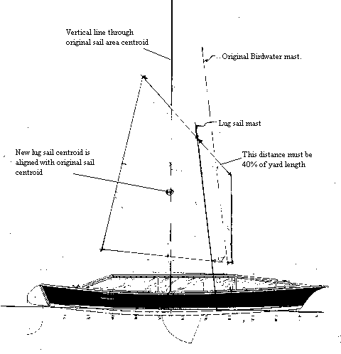 In this case I also show the location of the lug sail's mast. It MUST cross the yard very close to 40% back from the sail's luff. Otherwise that yard won't behave well in practice. I also show the location of the original mast and it is clear that the lug sail mast will need a change in partner and step. There is no getting around it although on a slot top boat like Birdwatcher it is actually pretty easy to shift a mast fore and aft.