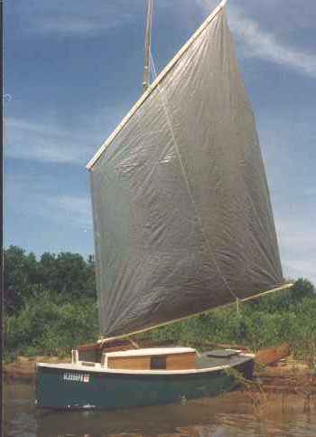 Sail rig is a large but simple 139 square foot balanced lug on an 18' mast. Mast is stepped off center to allow you to walk upright down the slot top and out the front. Should be rigged in an instant with no one going on deck ever. All very low tech built with common materials but effective.