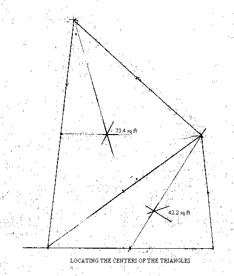 Next you will need to find the location of the center (centroid) of the area of the sail. Again you start by finding the centroid of the two triangles that make up the lug sail. To find the centroid of a triangle you make a tick mark at the mid point of each side, then draw a line from that tick mark to the opposite vertex. Do that for each side and you will have three lines that all intersect at the centroid of the triangle. (Actually you only need to find it with two lines but the third line makes a good check.) Again all of this is done with pencil and ruler on the scale drawing. Here is the job for the Jinni lug sail: