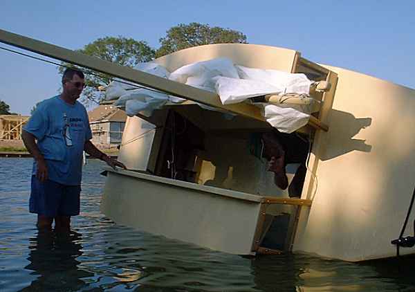 But we were finding it was not all that foolproof. Scram Pram, which is a 16' x 6' version of IMB, was tested to capsize twice (once accidentally, once on purpose) and found to lie stable on its side when knocked down to 90 degrees. That was not much of a worry since Scram is supposed to have 300 pounds of water ballast and when that ballast was tried on the prototype, the boat quickly self rigthed from 90 degrees. There was a feeling that much less ballast was needed. But the fact was that with one large crewmember inside acting as ballast, the Scram would not self right without the water ballast.