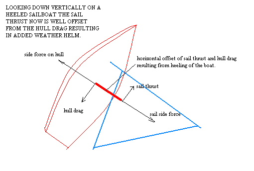 Looking straight down from above, now the force of the sail is way off to one side. The sail's thrust is trying to rotate the hull into the wind on the heeled boat. The effect is usually quite powerful, sometimes to the point where the skipper or the rudder can't hold the boat on course. The more she heels, the greater the rotational force and the greater the rudder forces needed to hold it.