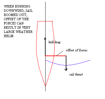 Next there is sail trim. The more the sail is boomed out, the more weather helm you will have since the now the sail's forces are swinging off to one side. The extreme will be when you have it boomed out 90 degrees and all of the force is trying to rotate the hull to windward. On boats with long booms and shallow rudders, as with traditional catboats, this can be a limiting factor on your control in that the rudder may not be able to counteract the sail force and she will swing into the wind no matter what. You may have to tack downwind.